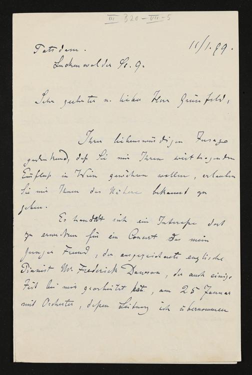 eigenhändiger Brief von Karl Klindworth an Heinrich Grünfeld