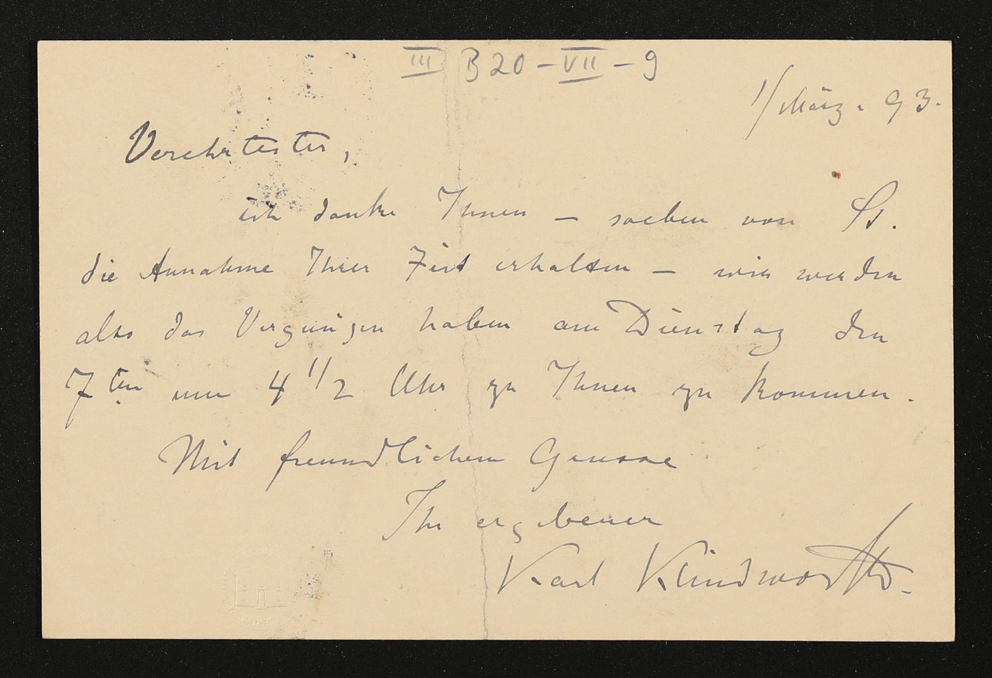 eigenhändige Postkarte von Karl Klindworth an Heinrich Grünfeld