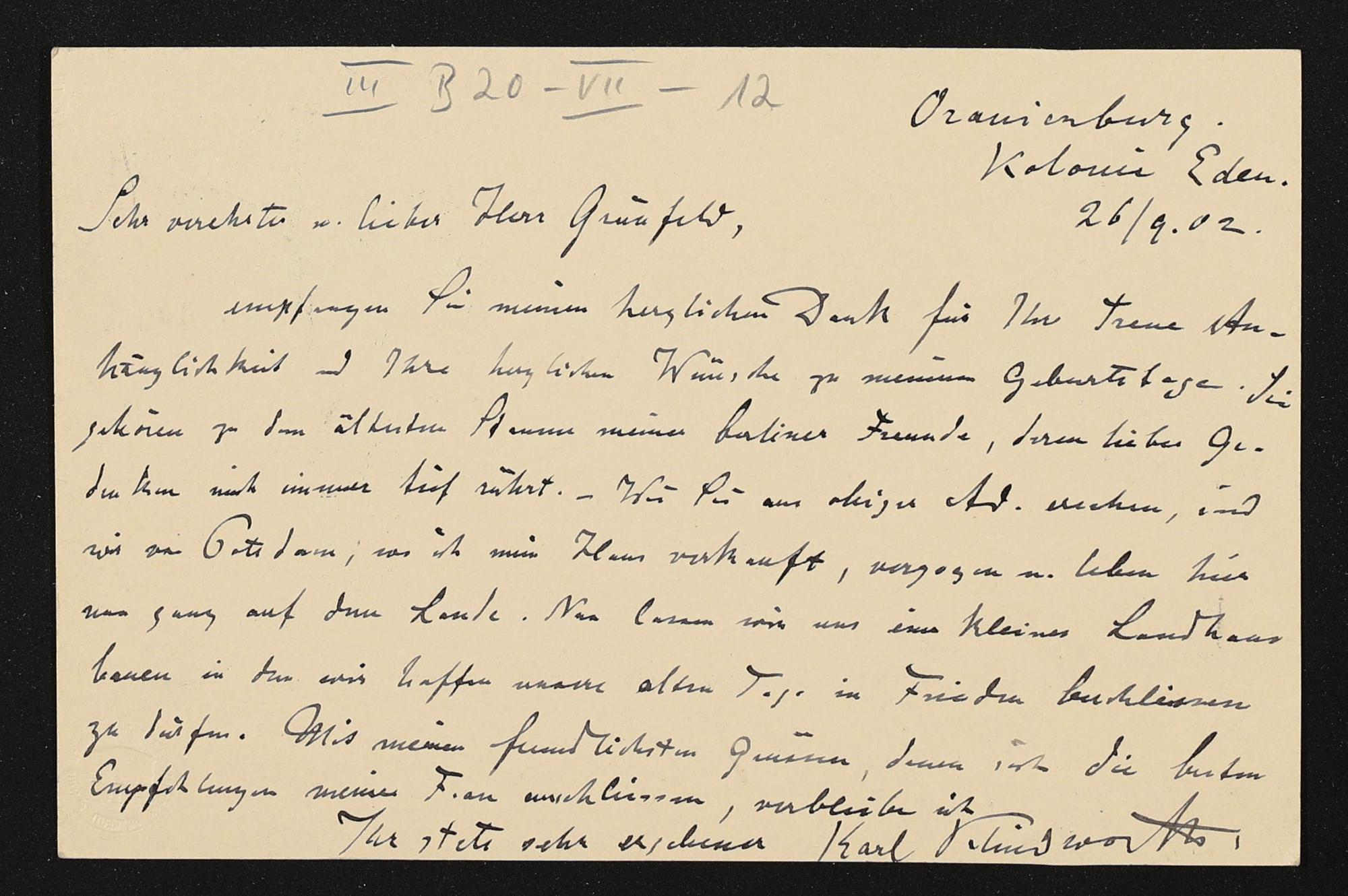 eigenhändige Postkarte von Karl Klindworth an Heinrich Grünfeld