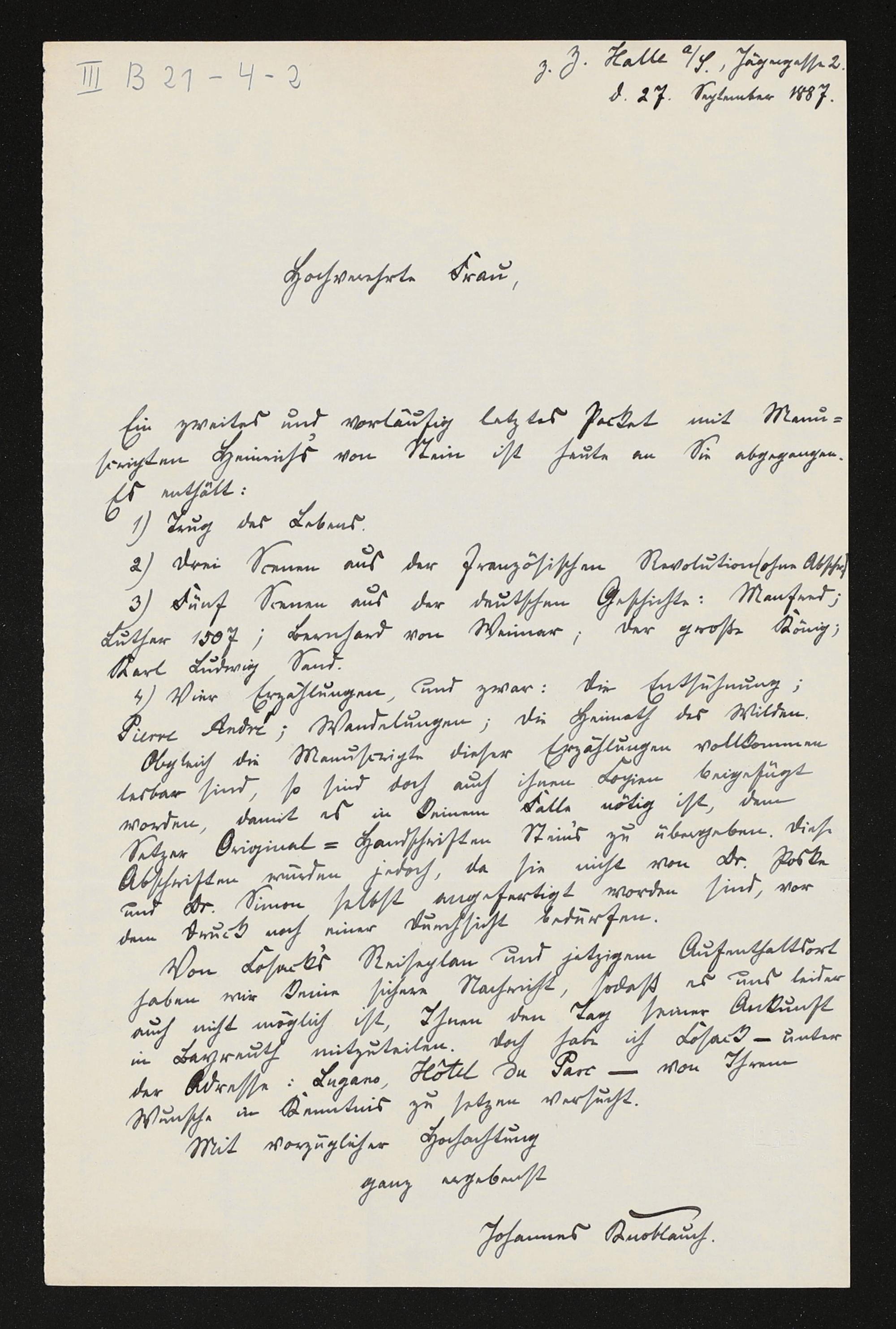 eigenhändiger Brief von Johannes Knoblauch an Cosima Wagner