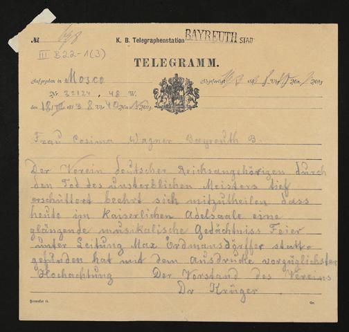 Telegramm von Unbekannt Krüger an Cosima Wagner