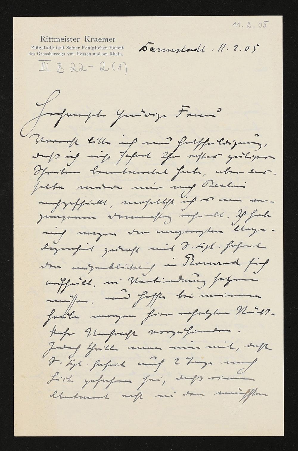 eigenhändiger Brief von Rittmeister Kraemer an Cosima Wagner