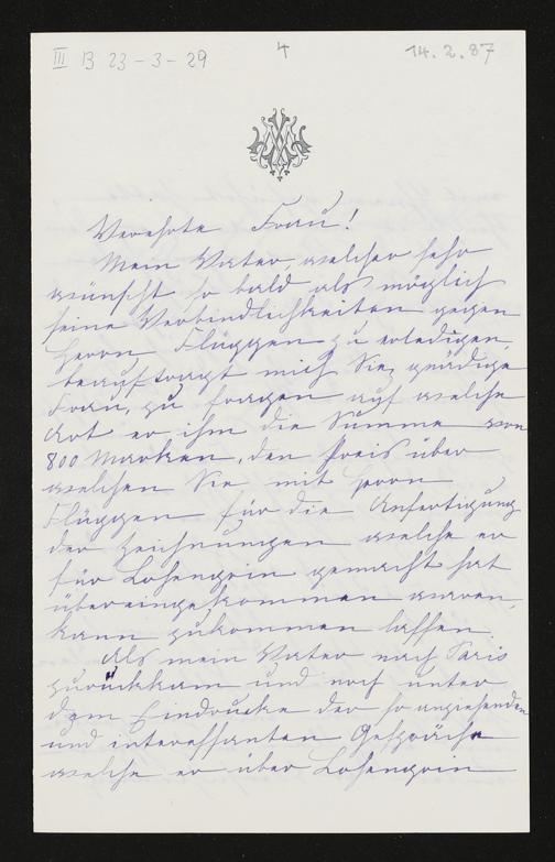 eigenhändiger Brief von Margurite Lamoureux an Cosima Wagner