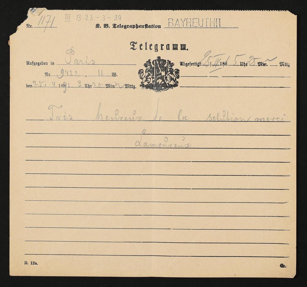 Telegramm von Charles Lamoureux an Adolf von Gross