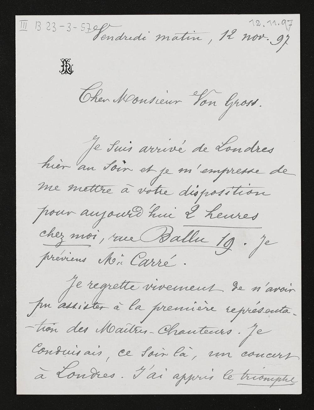 eigenhändiger Brief von Charles Lamoureux an Adolf von Gross