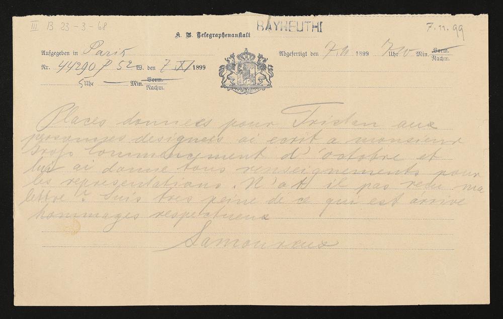 Telegramm von Charles Lamoureux an Cosima Wagner