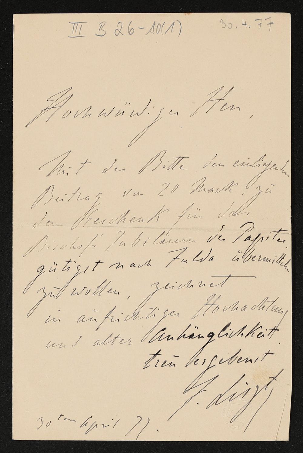 eigenhändiger Brief von Franz Liszt an Pfarrer Hohmann