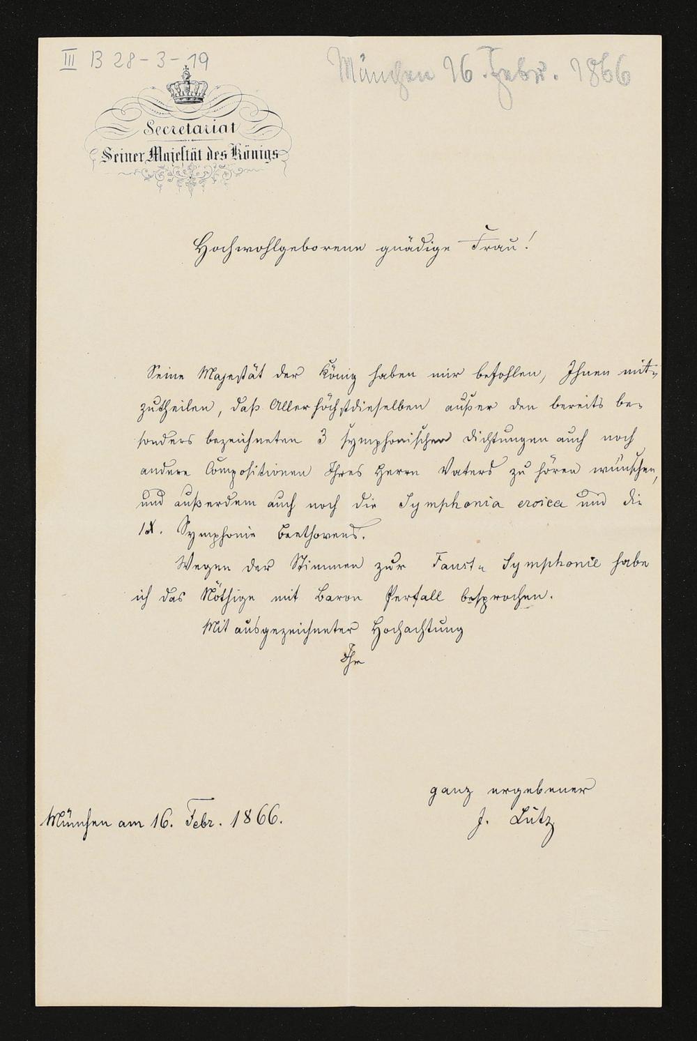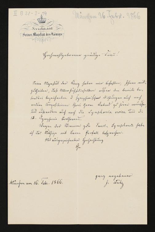 eigenhändiger Brief von Johann Freiherr von Lutz an Cosima Wagner