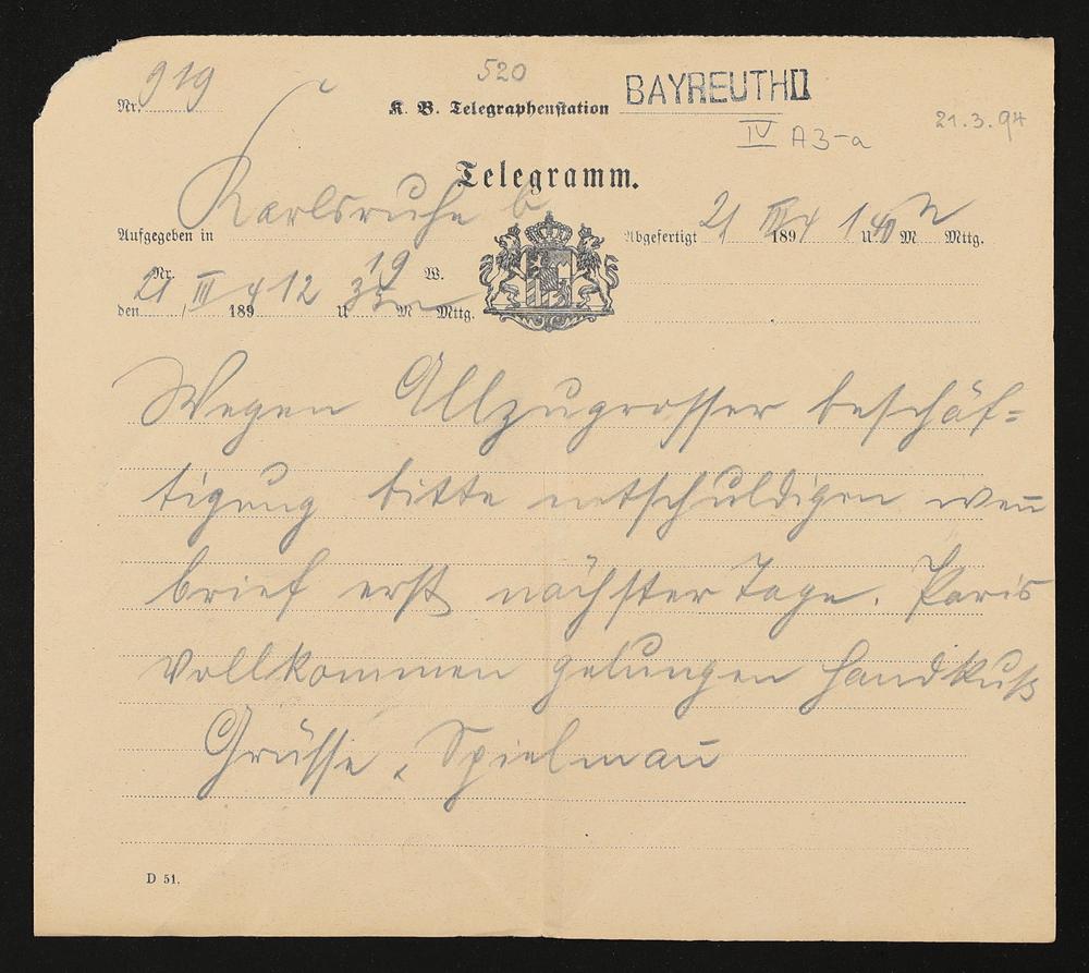 Telegramm von Felix Mottl an Cosima Wagner