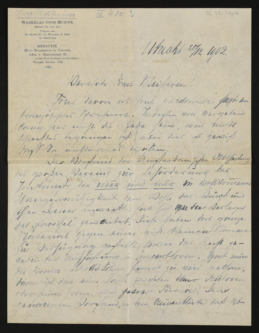 eigenhändiger Brief von Hugo Nolthenius an Cosima Wagner