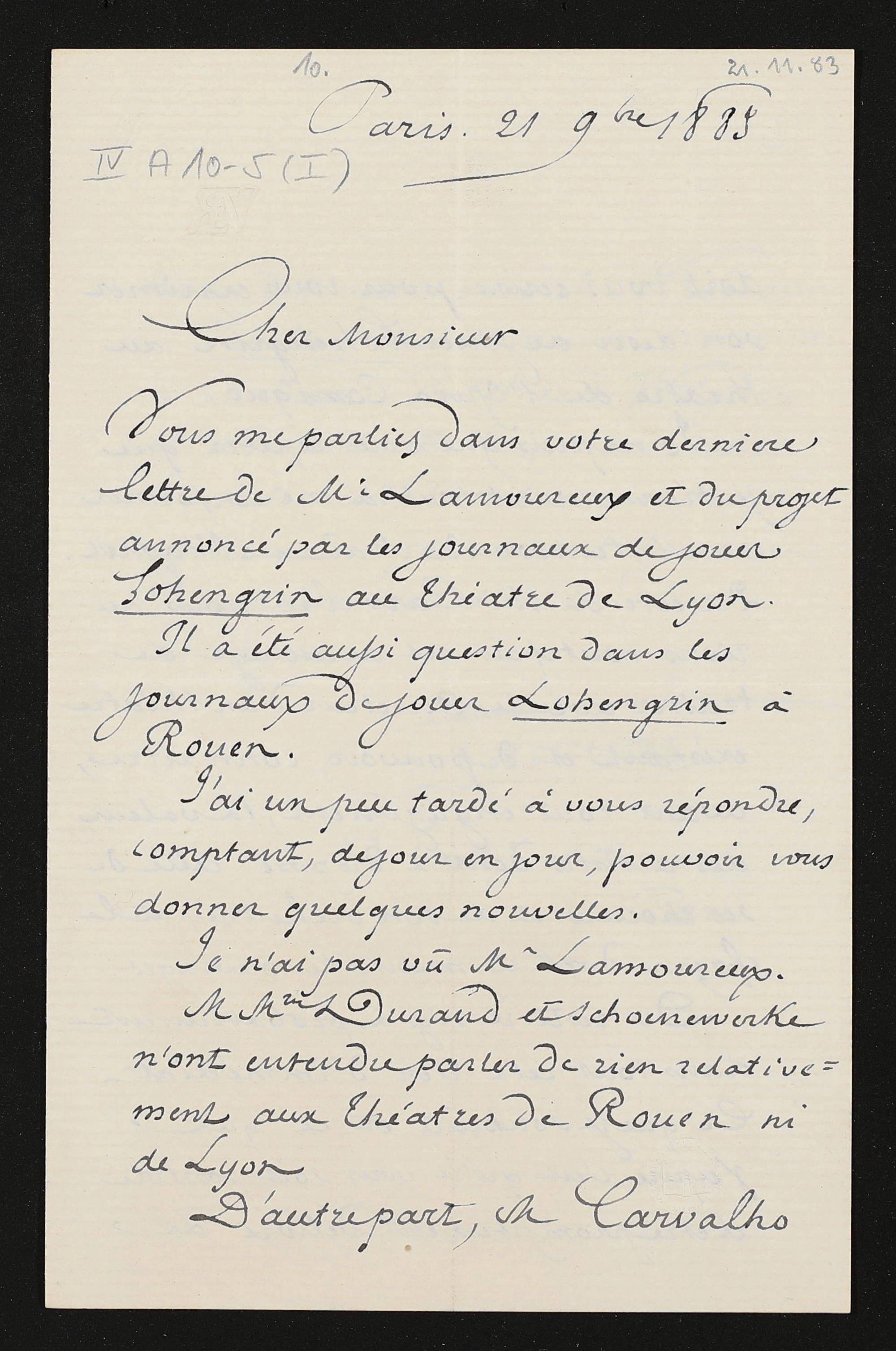 eigenhändiger Brief von Charles Nuitter mutmaßlich an Adolf von Gross, beiliegend: Zeitungsartikel zu "Aufführungen Wagner'scher Tondramen in Frankreich"