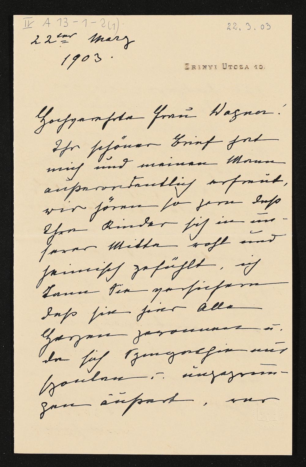 eigenhändiger Brief von Fanny Festelies Pálffy an Cosima Wagner