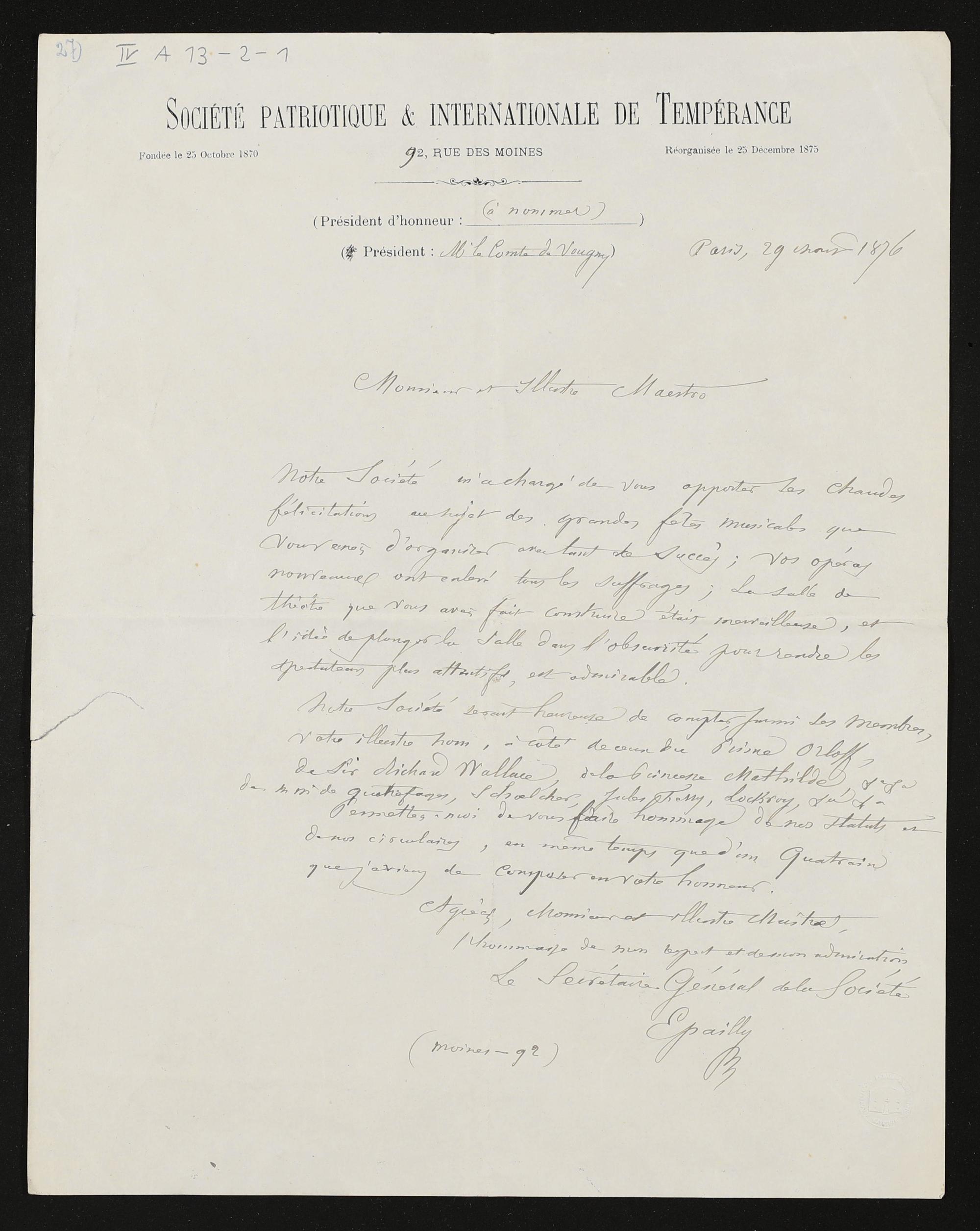 eigenhändiger Brief mutmaßlich von Claude-Célestin Epailly (Société Patriotique & Internationale de Tempérance) an Richard Wagner