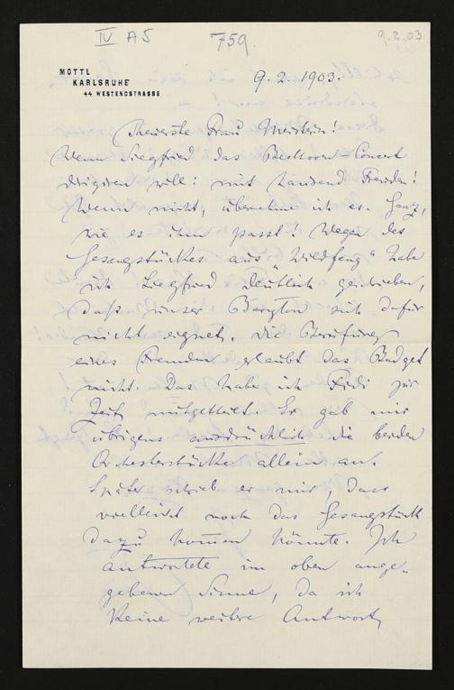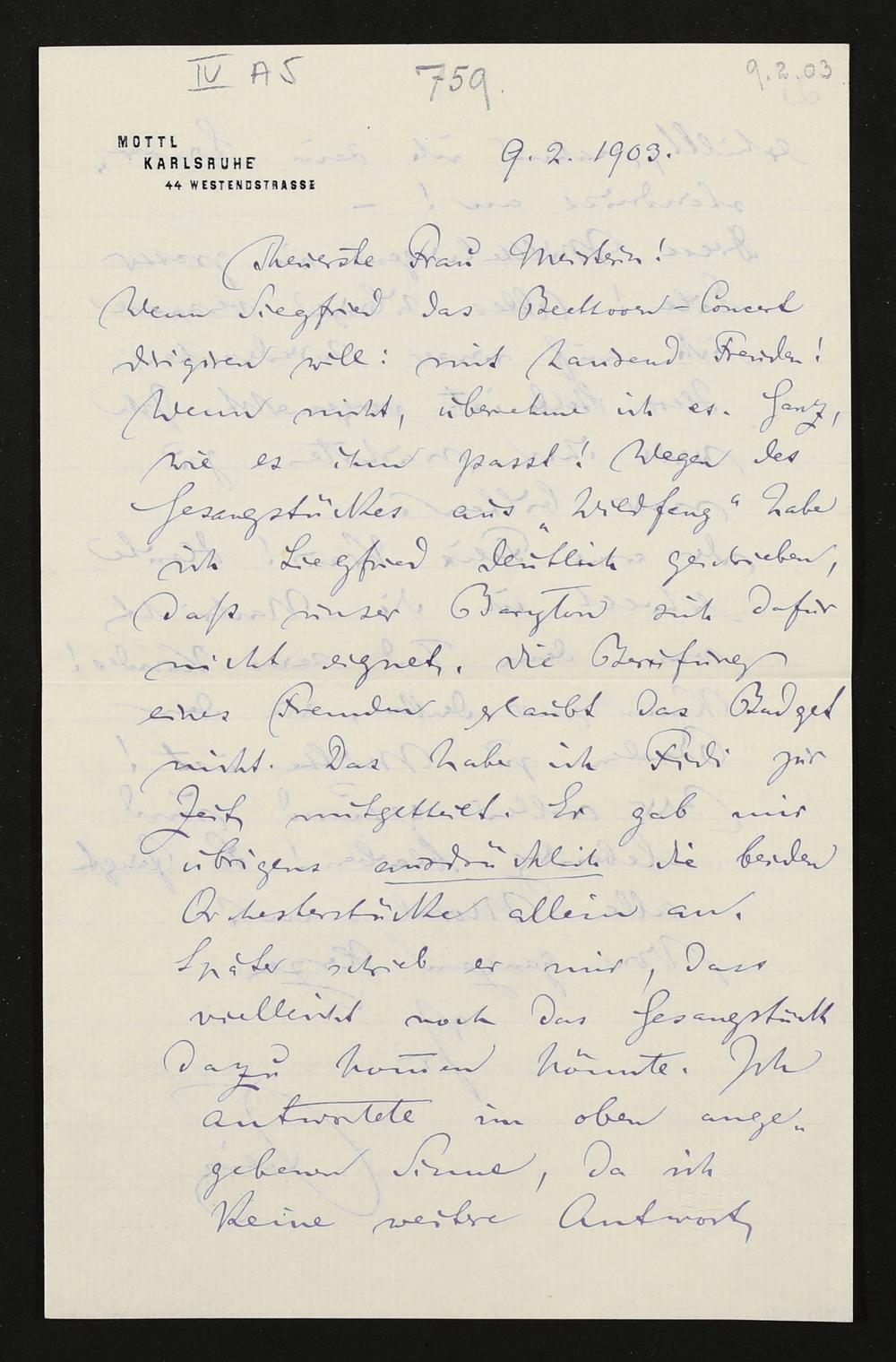 eigenhändiger Brief von Felix Mottl an Cosima Wagner