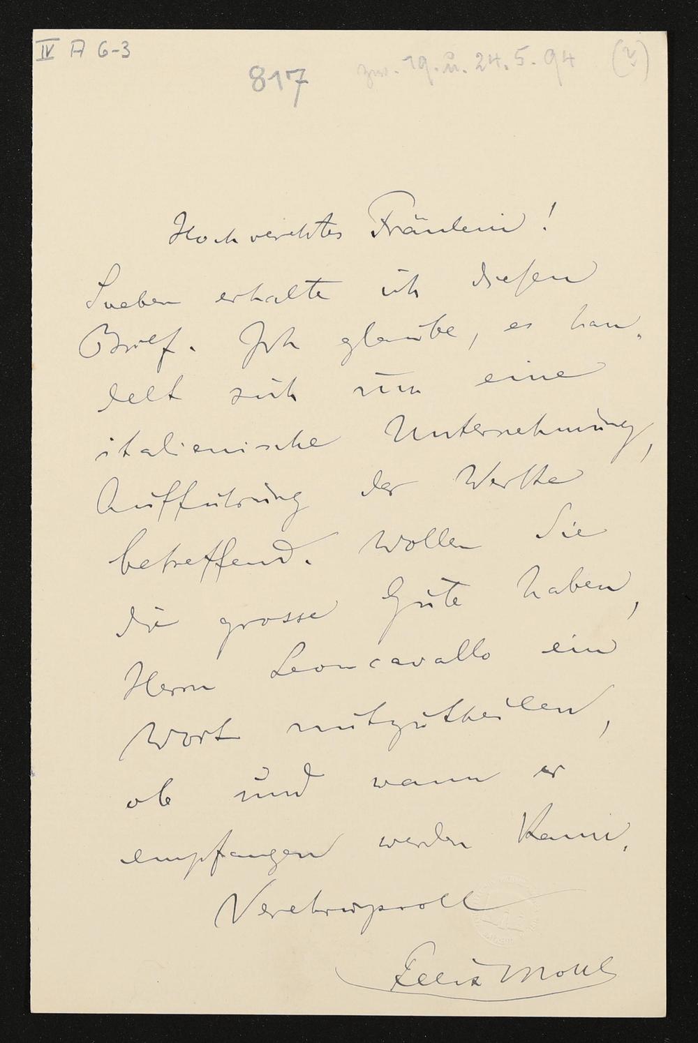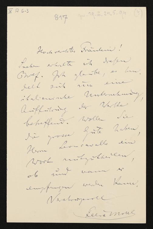 eigenhändiger Brief von Felix Mottl an Eva Wagner