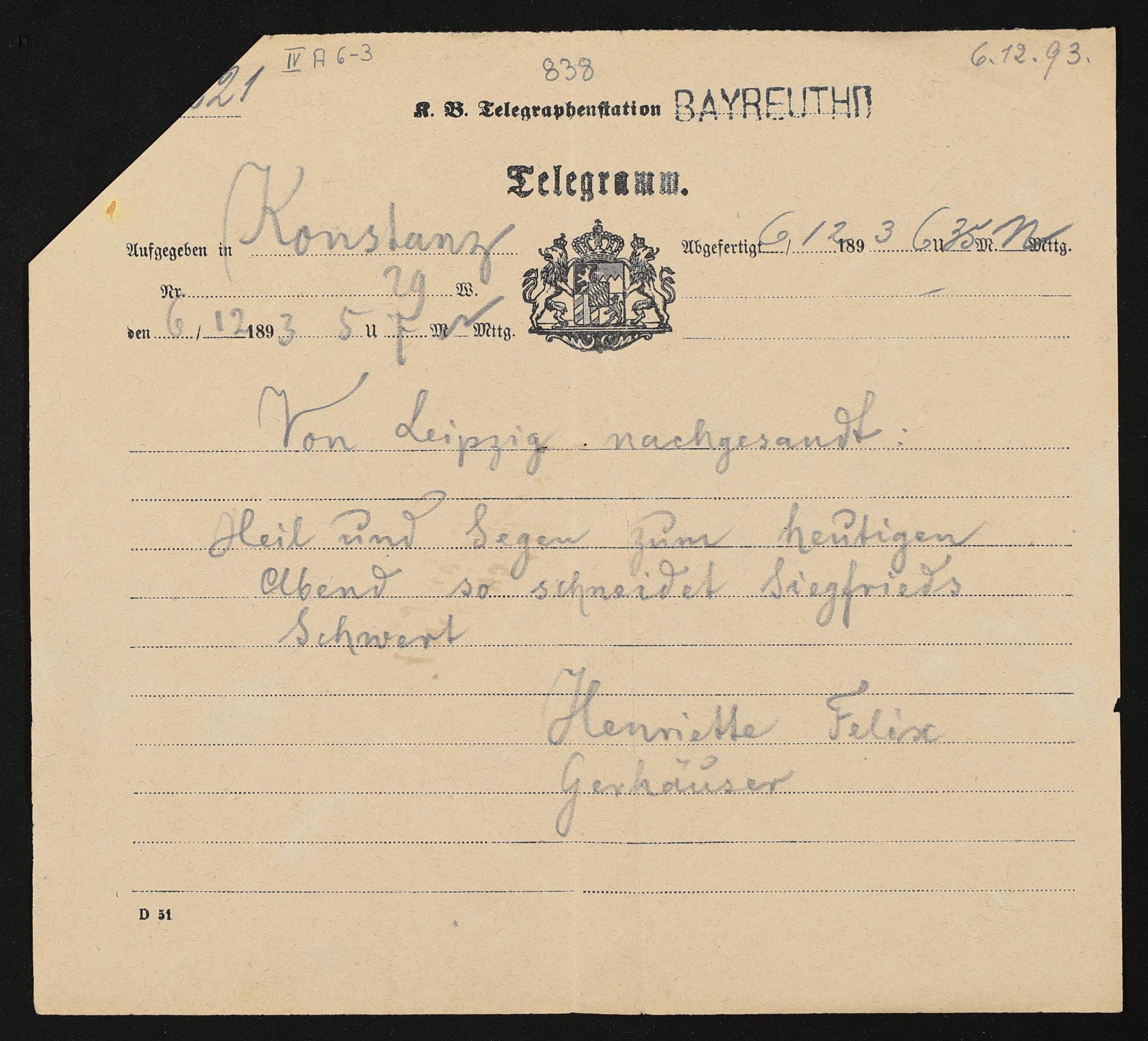 Telegramm von Felix Mottl und Henriette Mottl an Siegfried Wagner