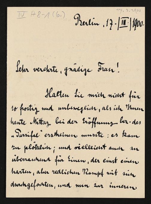 eigenhändiger Brief von Karl Muck an Cosima Wagner