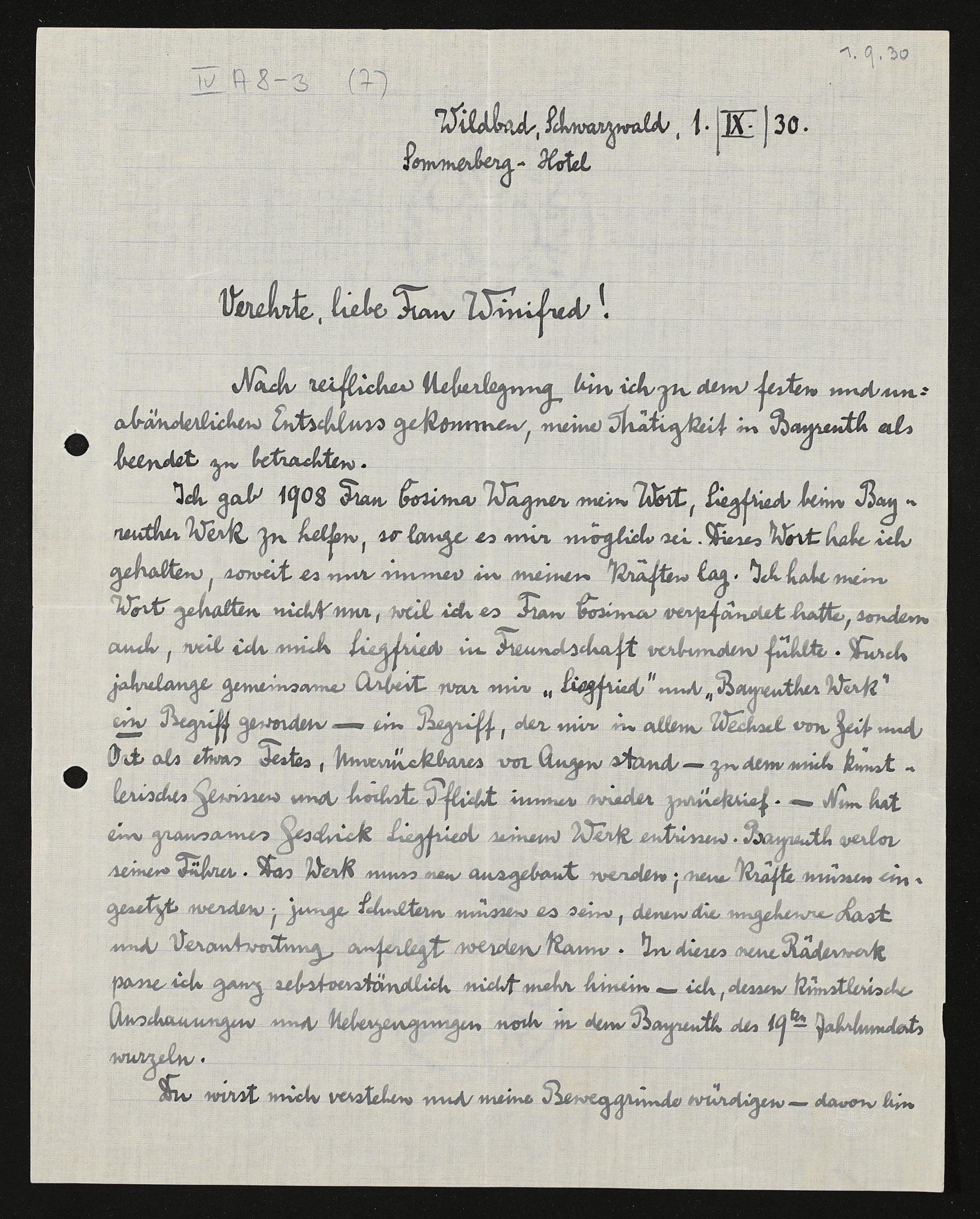 eigenhändiger Brief von Karl Muck an Winifred Wagner