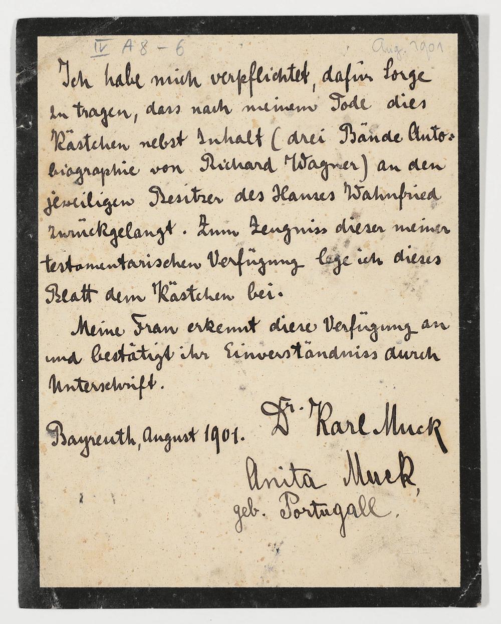 eigenhändige testamentarische Verfügung von Karl Muck über ein Kästchen mit drei Bänden der Autobiographie von Richard Wagner, eigenhändige Bestätigung von Anita Muck durch Unterschrift