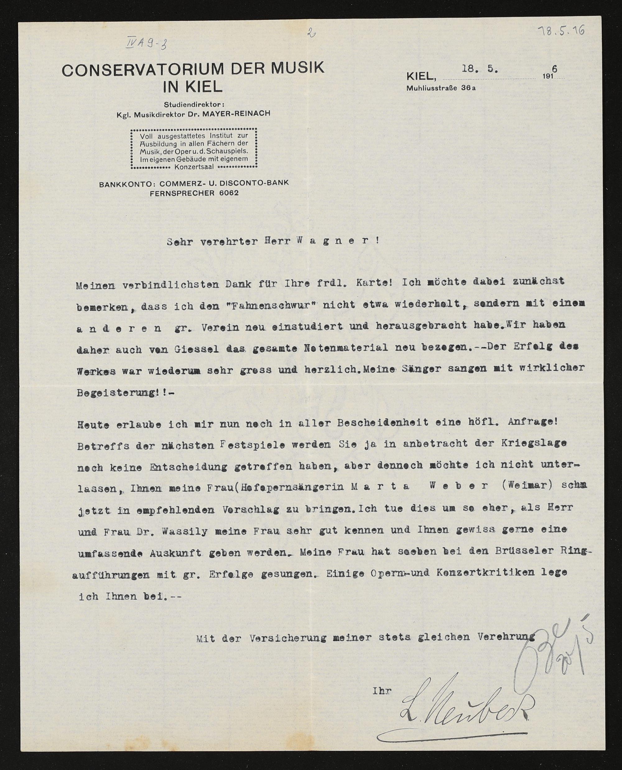 maschinenschriftlicher Brief von Ludwig Neubeck (Observatorium der Musik in Kiel) an Siegfried Wagner