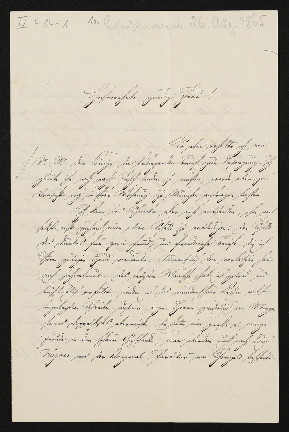 eigenhändiger Brief von Franz Seraph Pfistermeister an Richard Wagner