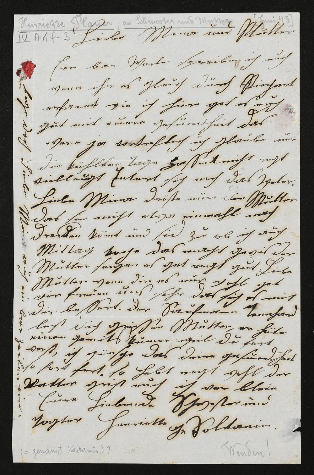 eigenhändiger Brief von Henriette Planer an Minna Wagner und Johanna Christiana Planer
