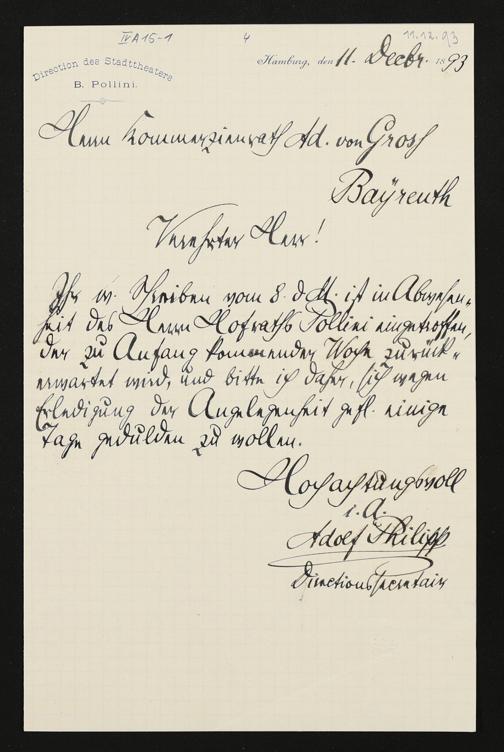 eigenhändiger Brief von Adolf Philipp (Direction des Stadttheaters B. Pollini) an Adolf von Gross