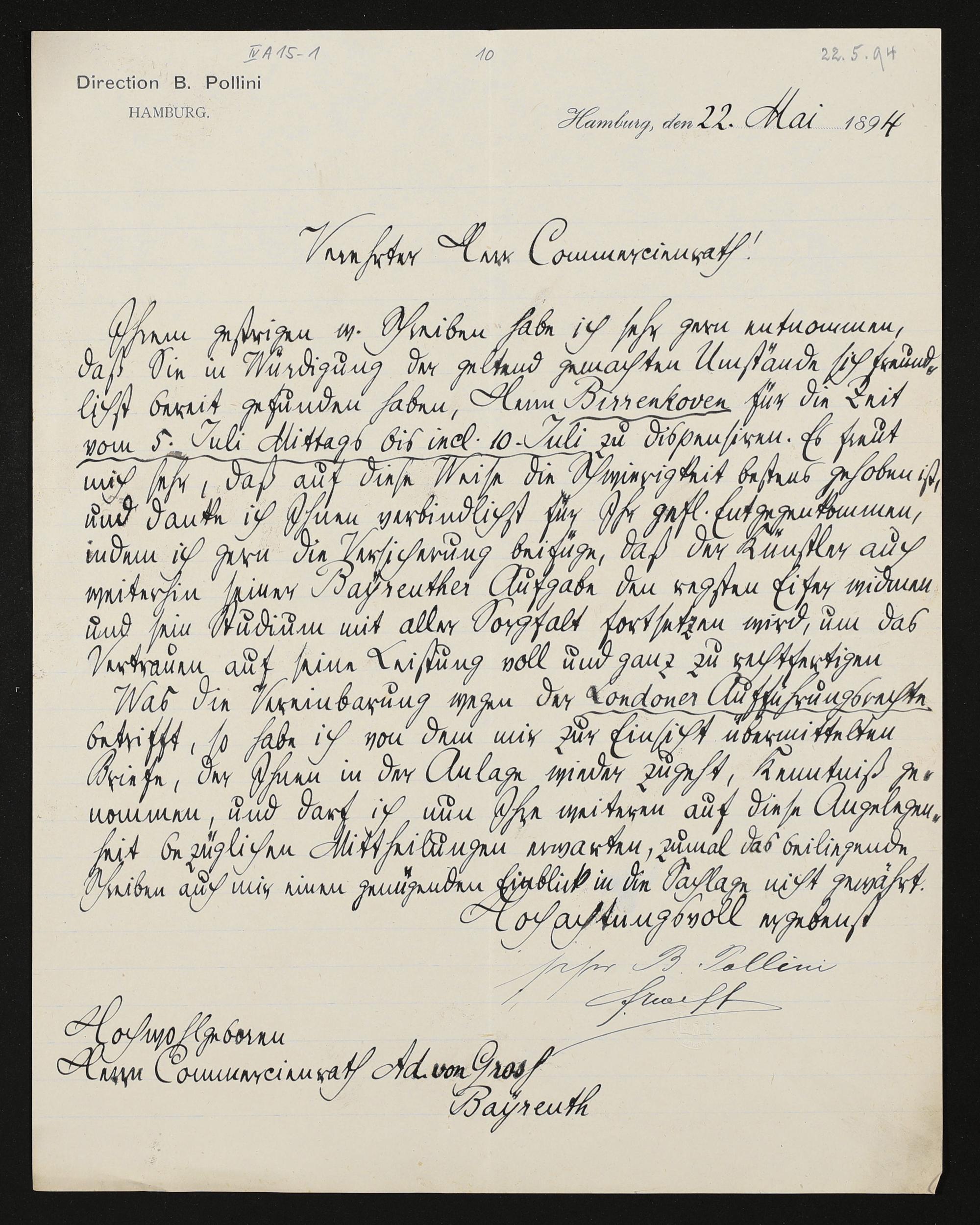 eigenhändiger Brief von B. Pollini an Adolf von Gross