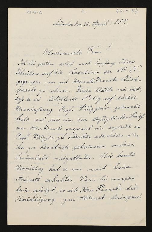 eigenhändiger Brief von Heinrich Porges an Cosima Wagner