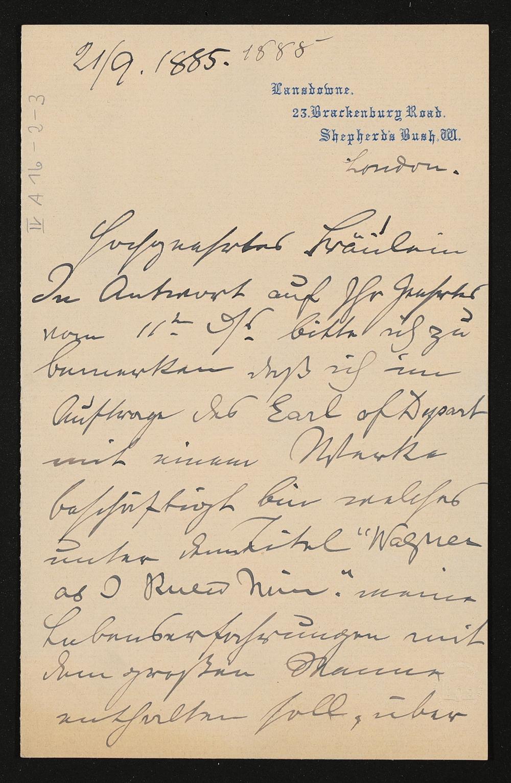 eigenhändiger Brief von Ferdinand Praeger mutmaßlich an Daniela von Bülow oder Eva Wagner
