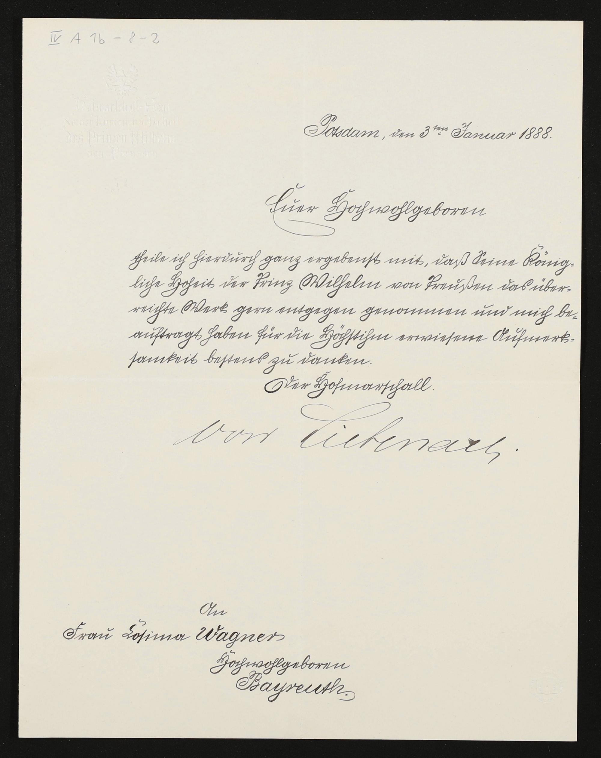 Eduard von Liebenau von Wilhelm Prinz von Preußen diktierter Brief an Cosima Wagner