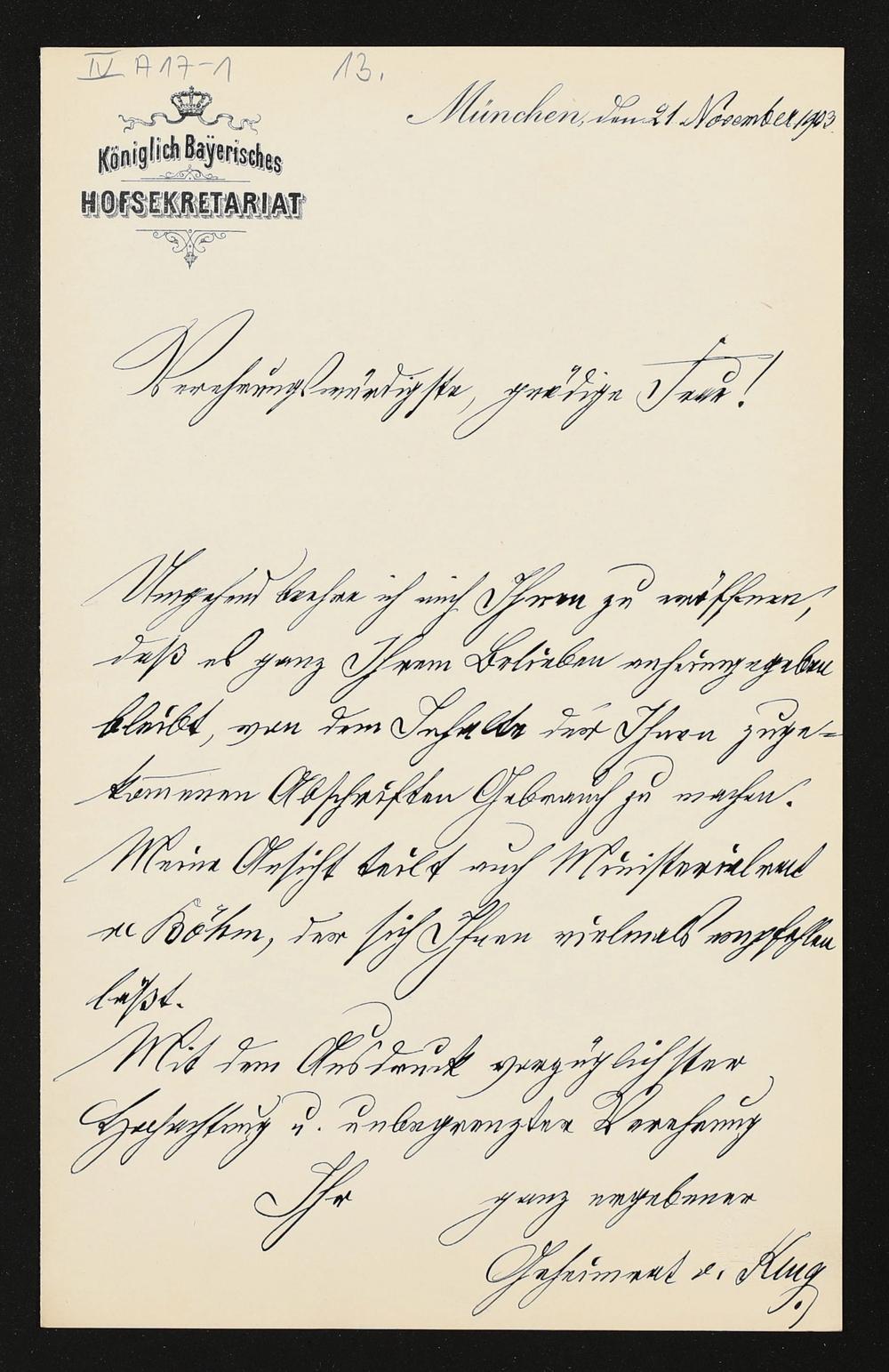 eigenhändiger Brief von Geheimrat Ludwig von Klug (Königlich Bayerisches Hofsekretariat) an Cosima Wagner