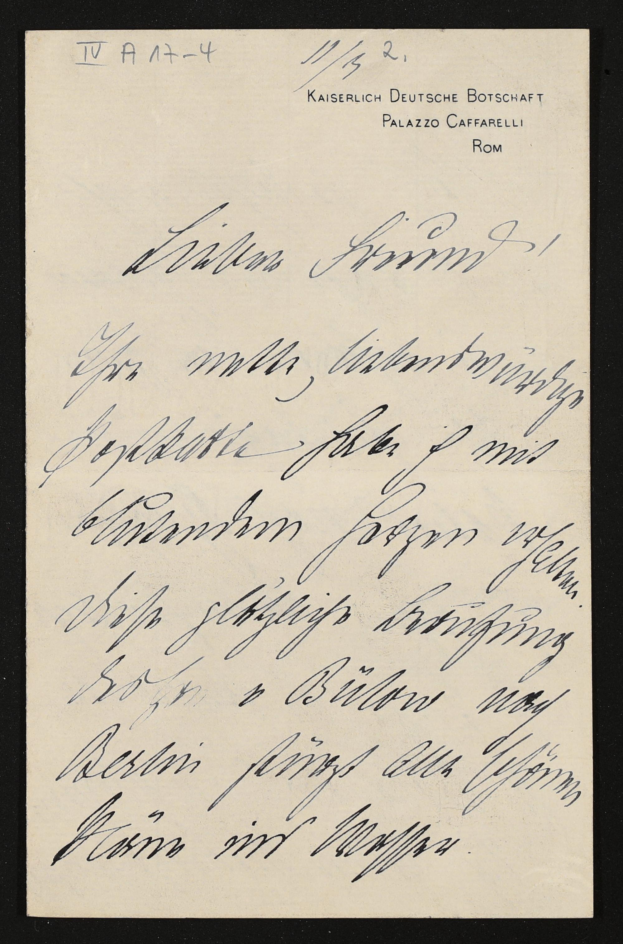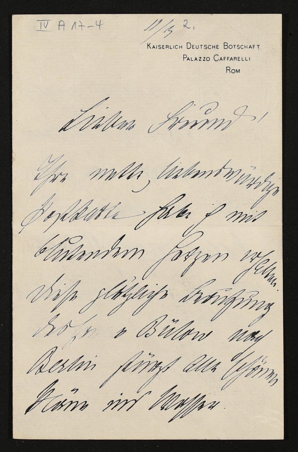 eigenhändiger Brief von Fürst Carl Pückler (Kaiserlich deutsche Botschaft) an einen unbekannten Empfänger