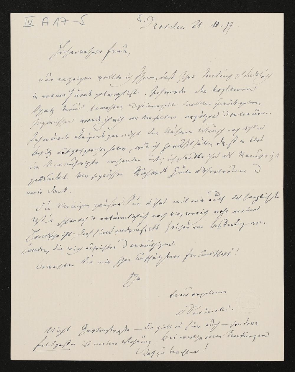 eigenhändiger Brief von Anton Pusinelli an Cosima Wagner