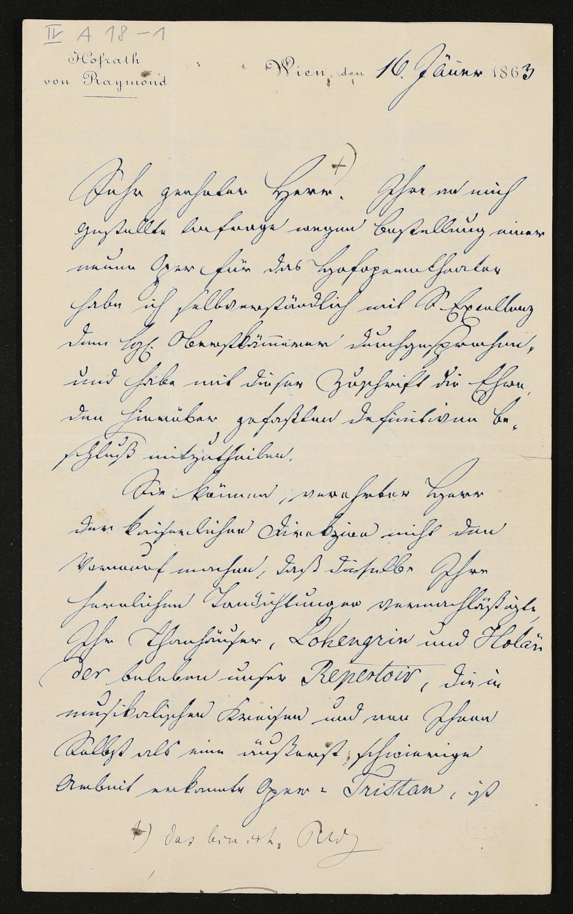 eigenhändiger Brief von Joseph von Raymond an Richard Wagner