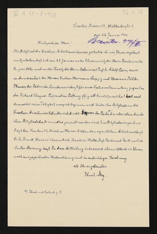 eigenhändiger Brief von Kurt Mey (Richard-Wagner-Stipendien-Stiftung) an Siegfried Wagner