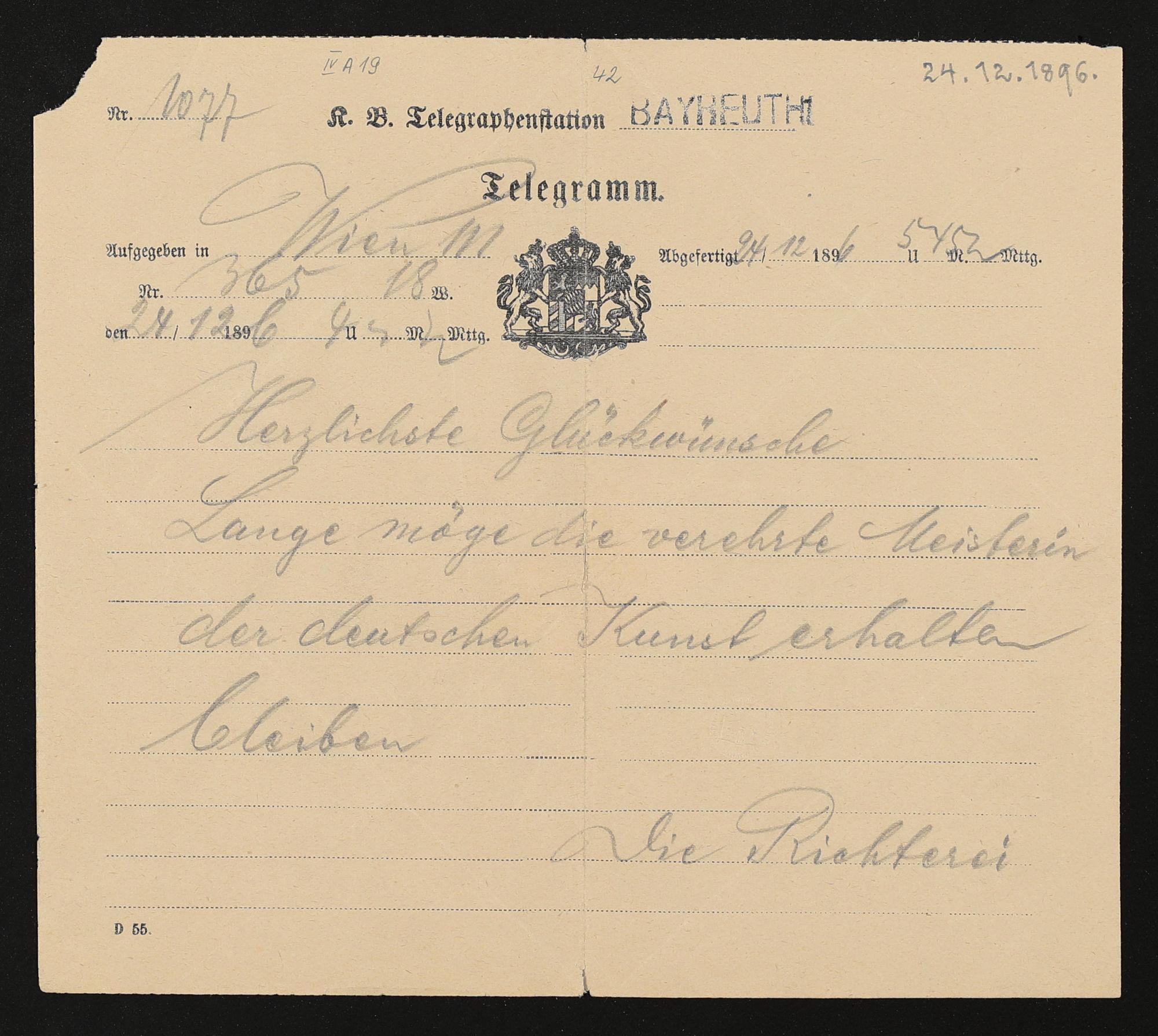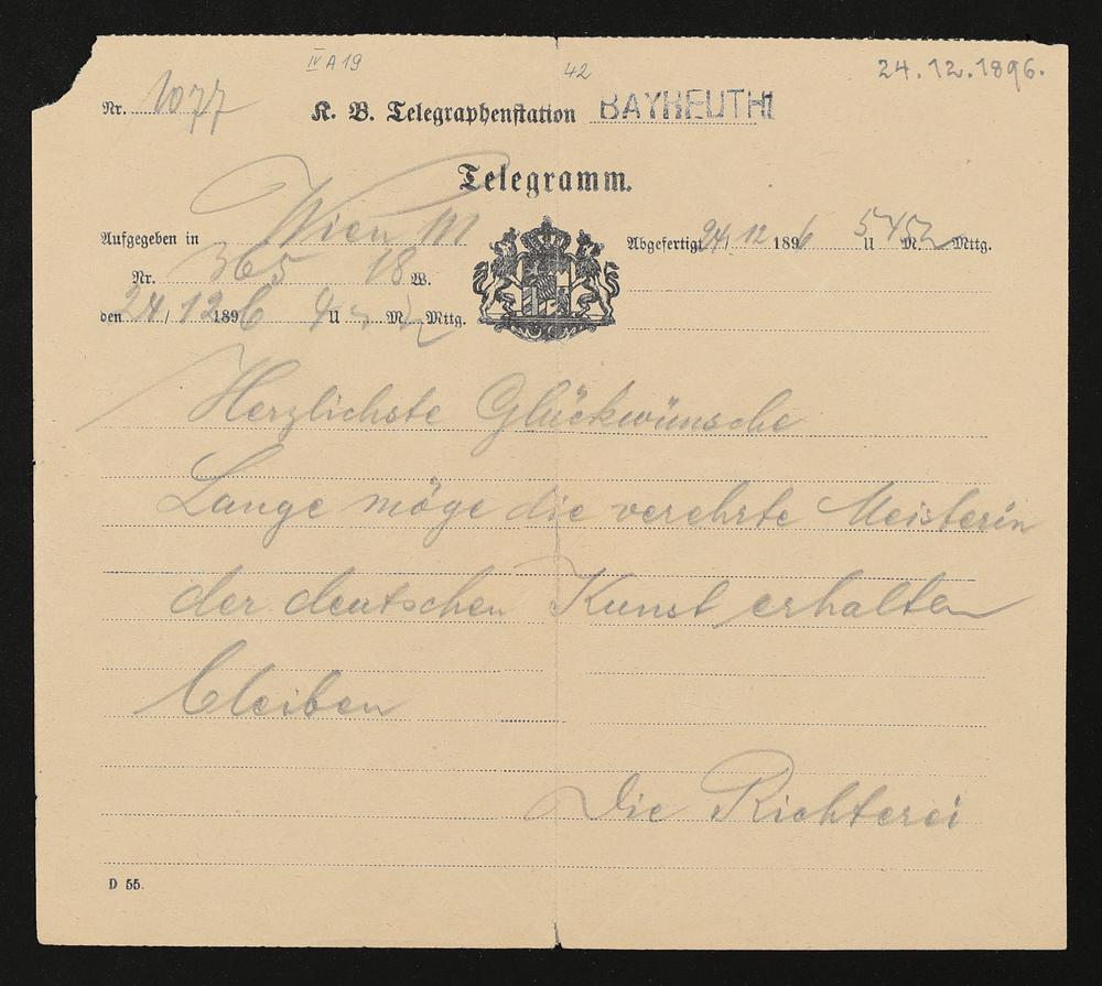 Telegramm von Hans Richter an Cosima Wagner
