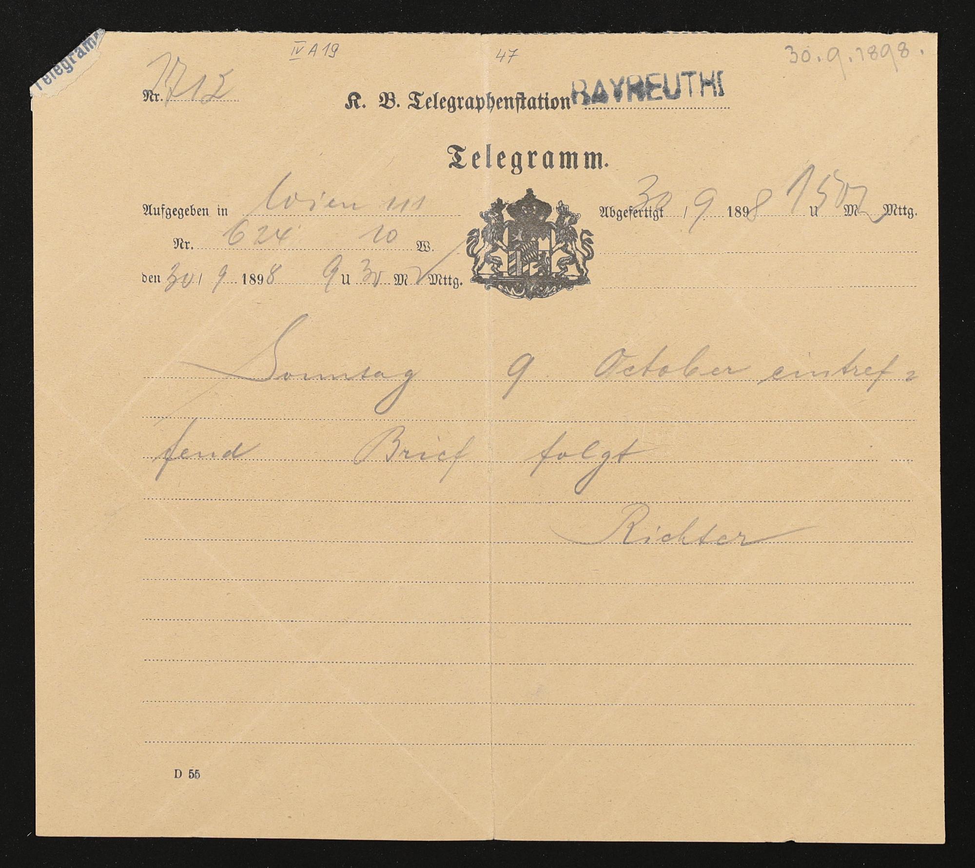 Telegramm von Hans Richter an Cosima Wagner