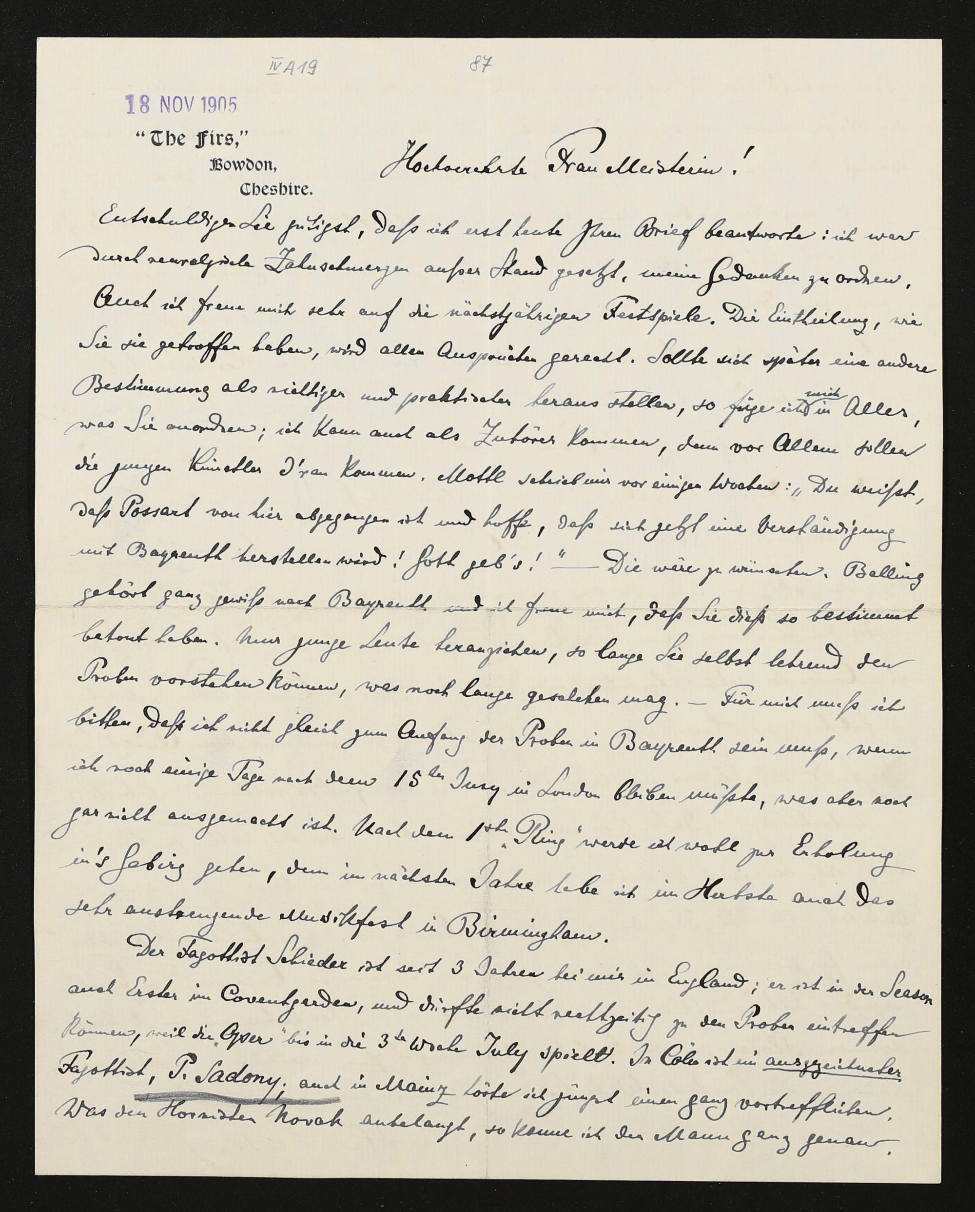 eigenhändiger Brief von Hans Richter an Cosima Wagner