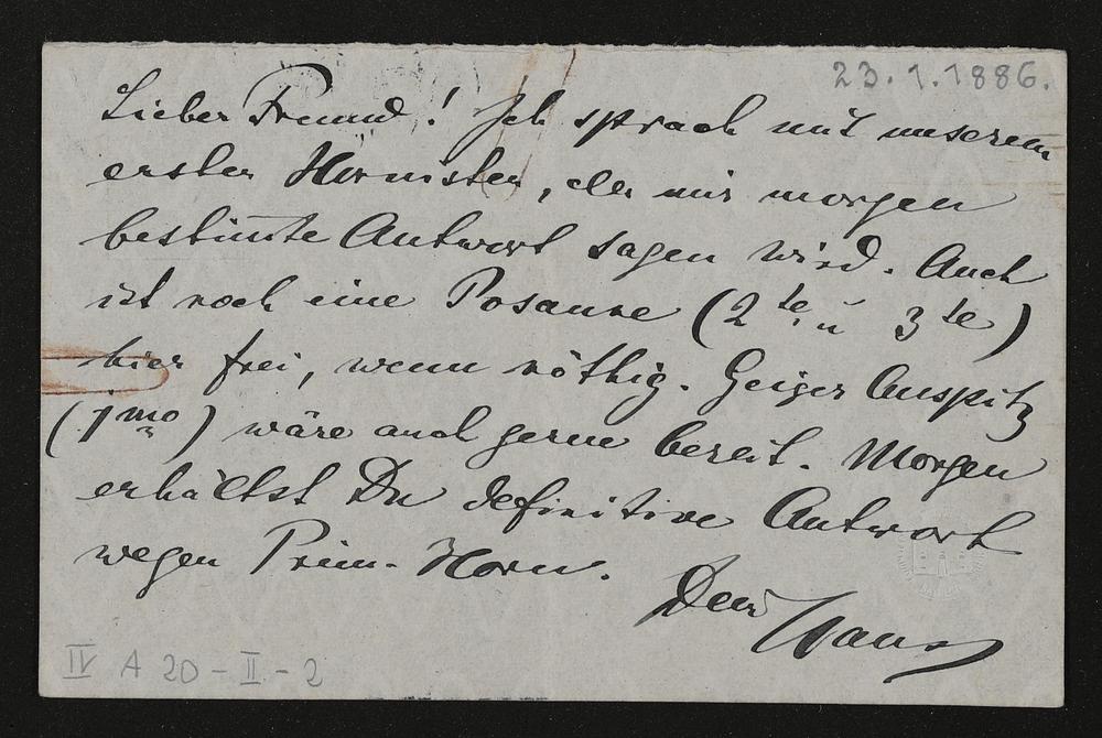 eigenhändige Postkarte von Hans Richter an Hermann Levi