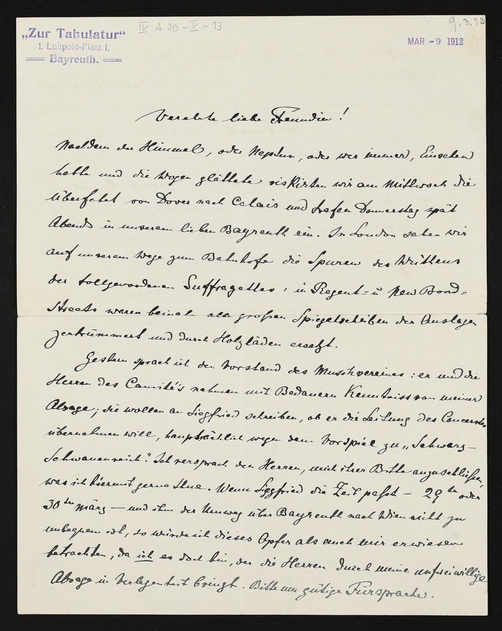 eigenhändiger Brief von Hans Richter an Eva Chamberlain