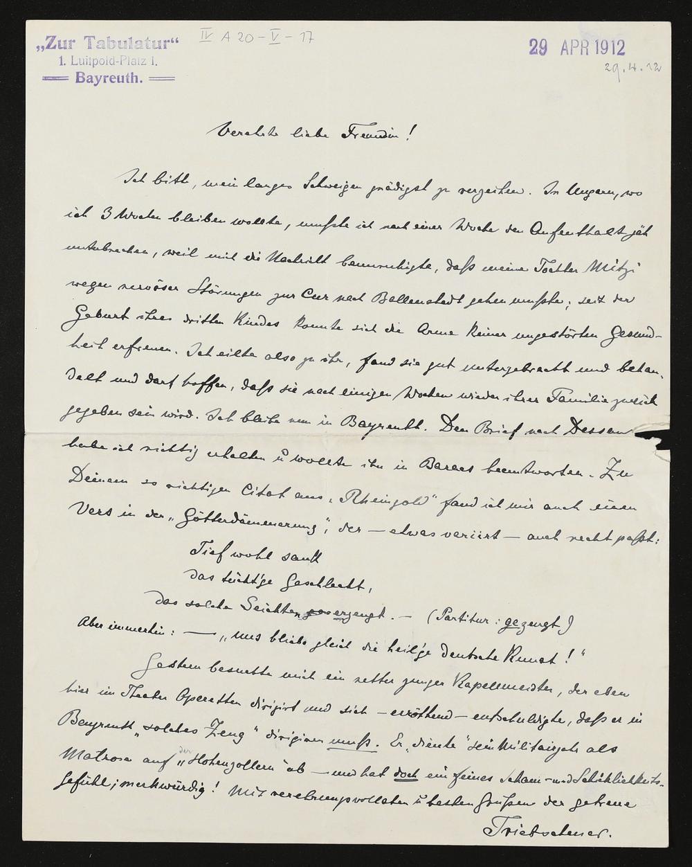 eigenhändiger Brief von Hans Richter an Eva Chamberlain