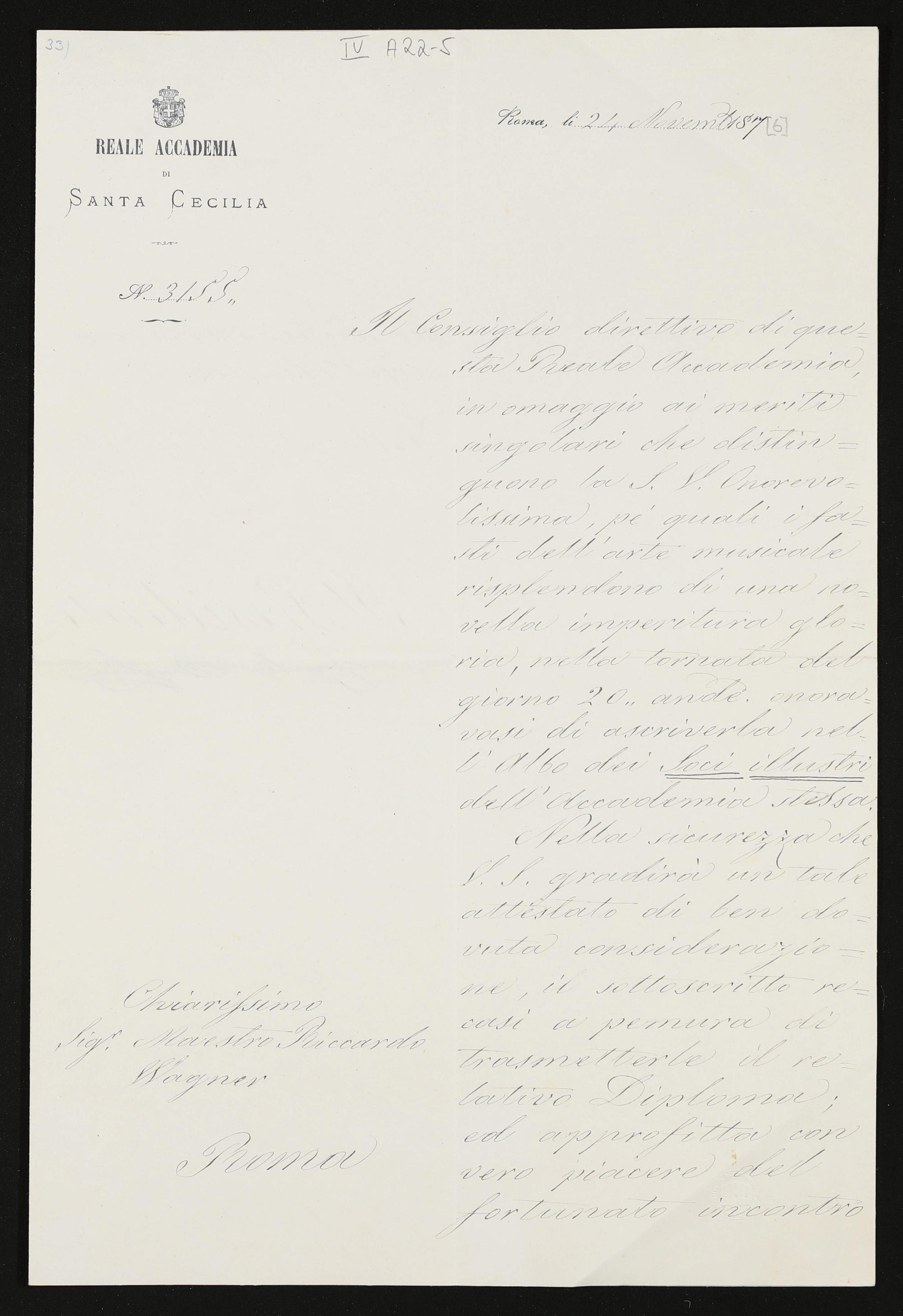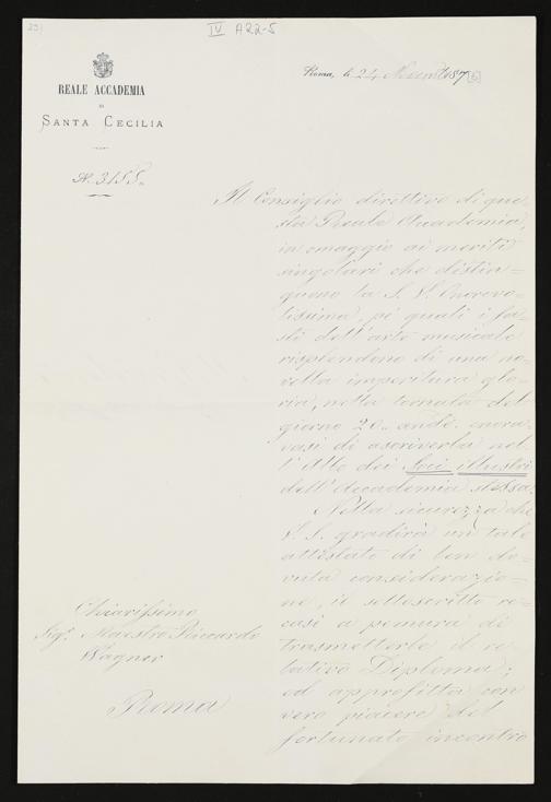 eigenhändiger Brief von Emilio Broglio (Reale Accademia di Santa Cecilia) an Richard Wagner