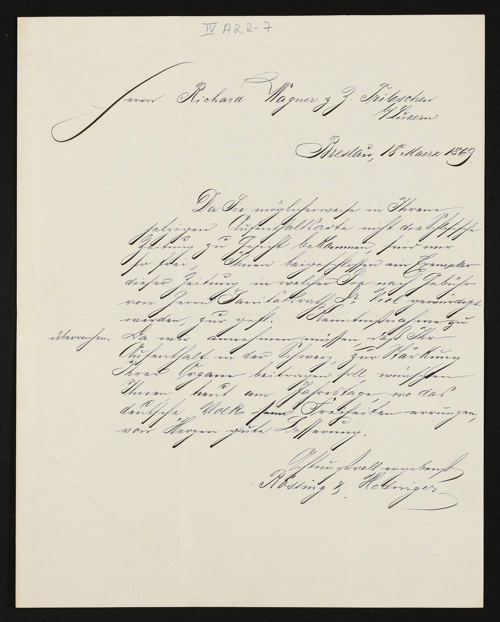 eigenhändiger Brief von Rössing & Hedinger an Richard Wagner
