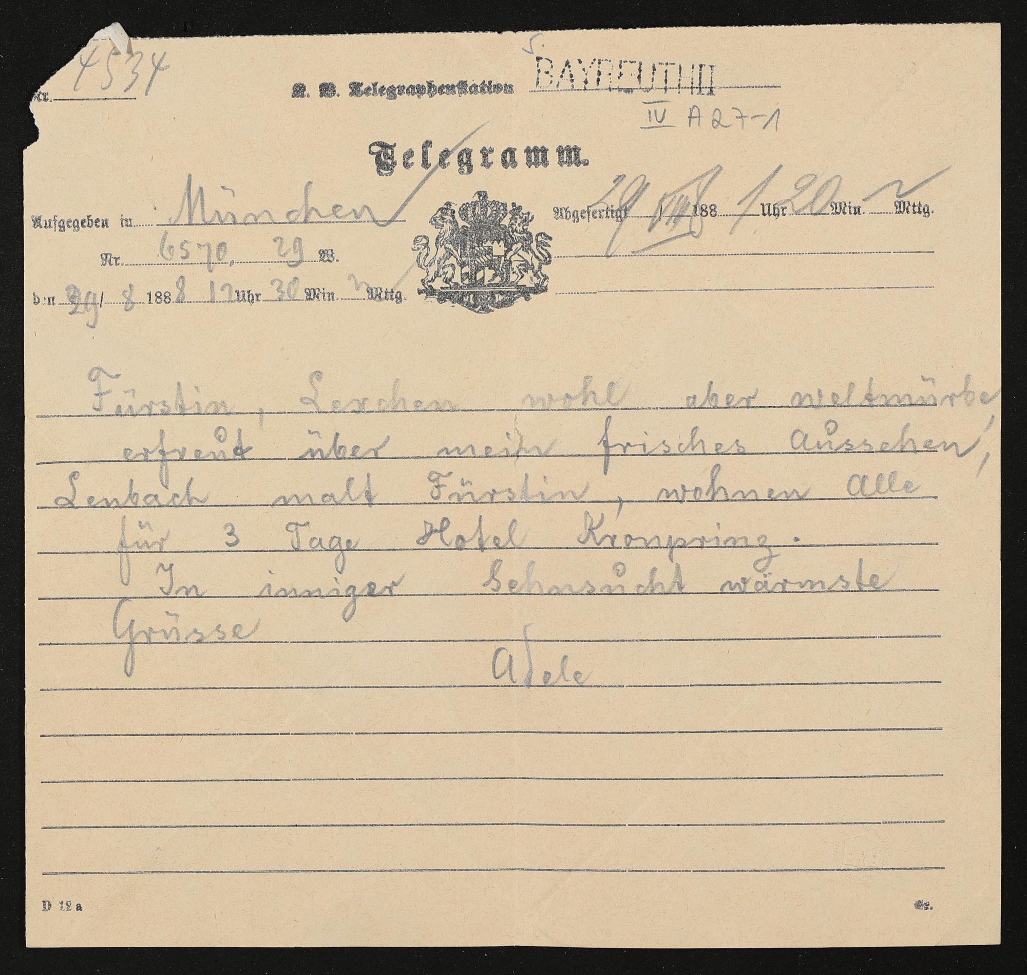Telegramm von Adele von Schleinitz an Eva Wagner