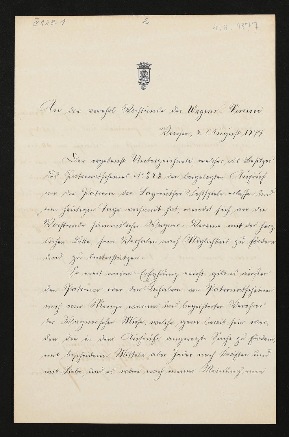 eigenhändiger Brief von Adolf Schmidt an die Vorstände der Richard Wagner Vereine