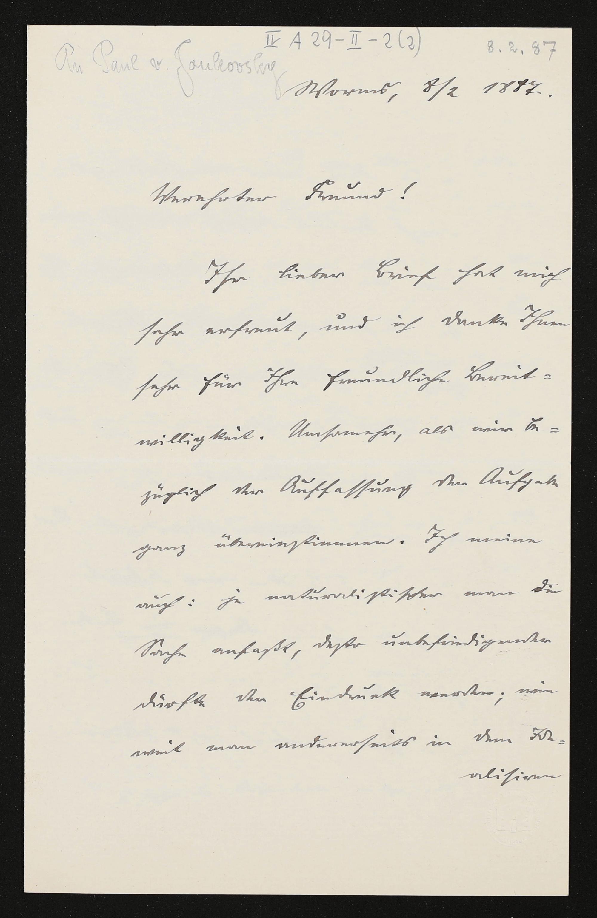 eigenhändiger Brief von Friedrich von Schoen an Paul von Jukowsky