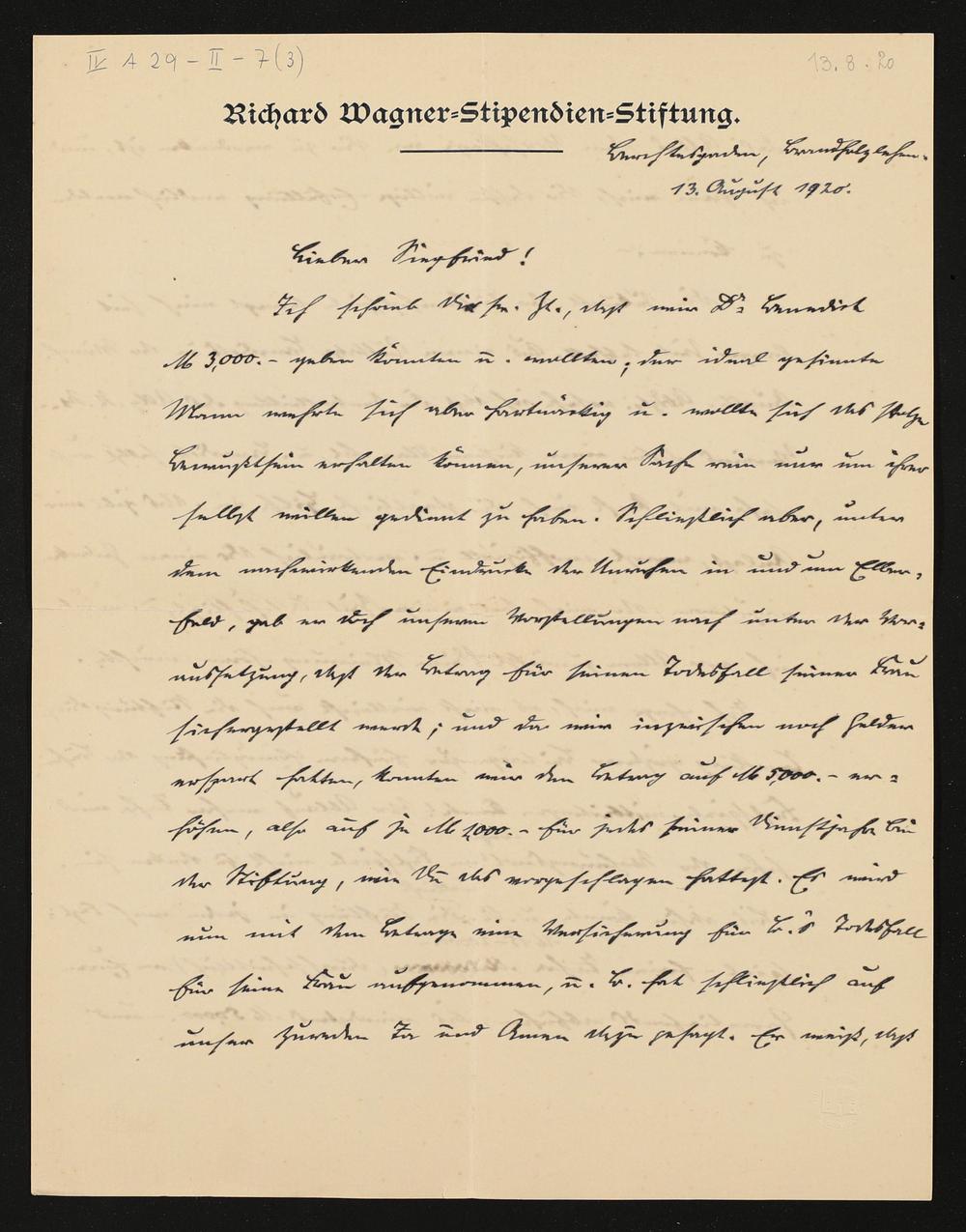 eigenhändiger Brief von Friedrich von Schoen (Richard-Wagner-Stipendien-Stiftung) an Siegfried Wagner