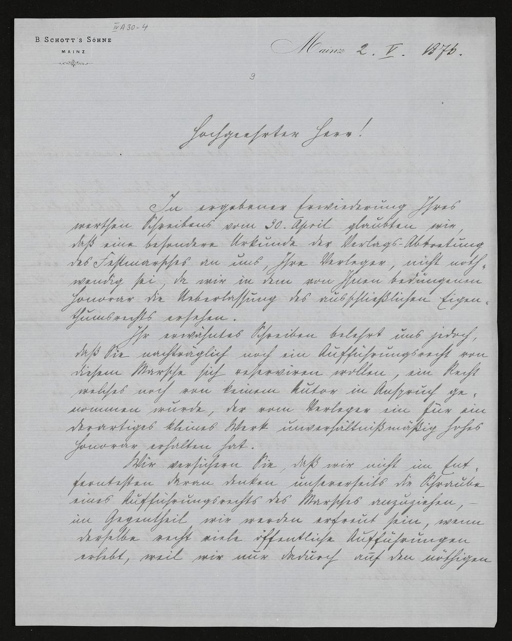 eigenhändiger Brief von B. Schott's Söhne an Richard Wagner