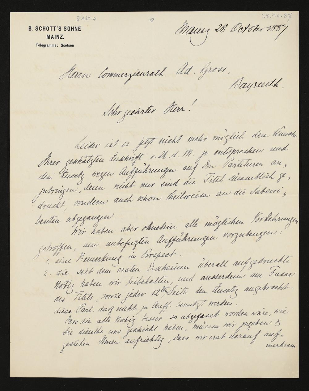 eigenhändiger Brief von B. Schott's Söhne an Adolf von Gross